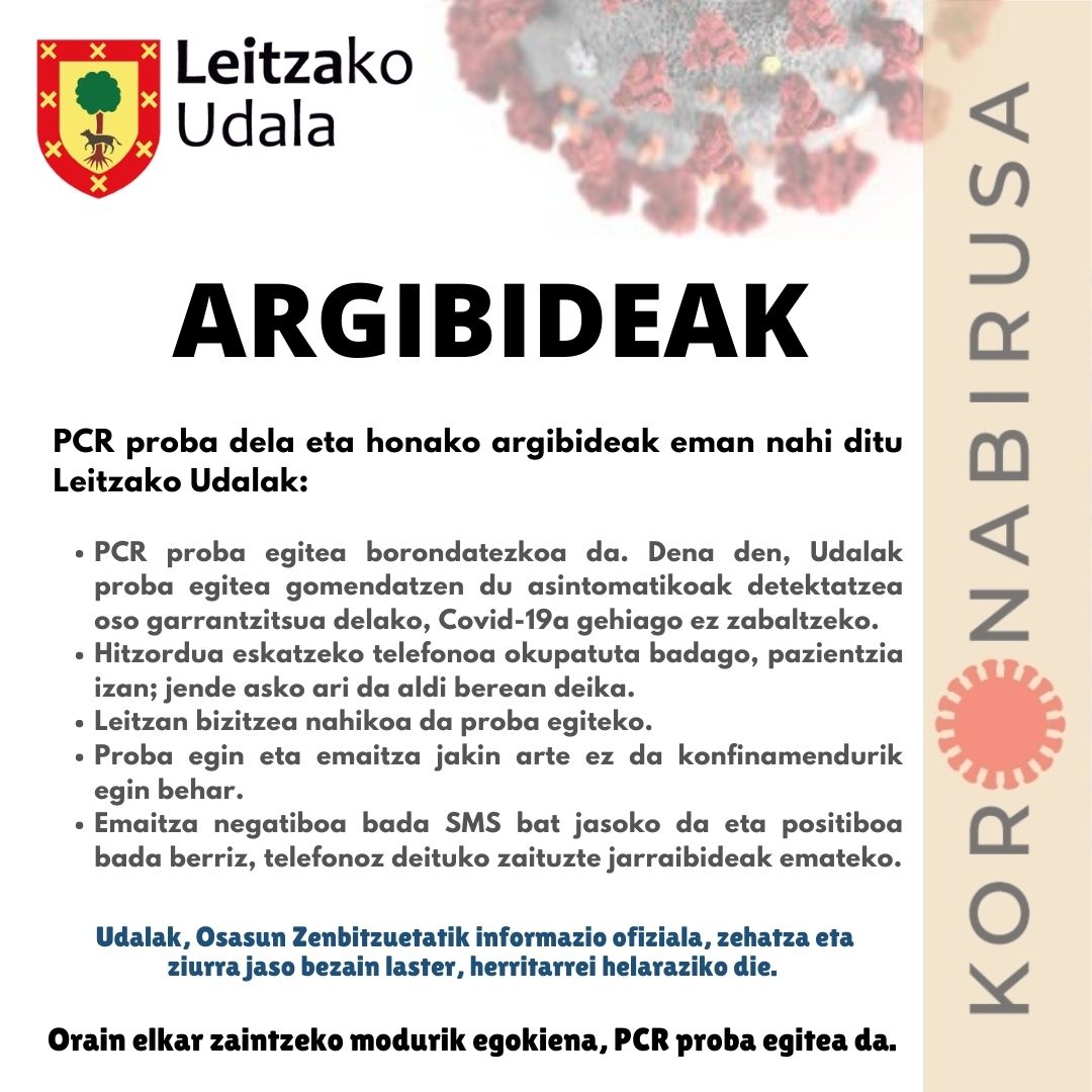 COVID-19 kasuen gorakada kezkagarriaren ondorioz eta honek biztanlerian izan duen hedapen anitza ikusita, datorren larunbatean eta igandean behaketa orokor bat egingo da Leitzan, 15 urtetik gorako biztanle guztiei PCR probak eginez, gutxi gorabehera 2.500 laguni. Izan ere, positibo asko erregistratu dira, eta horiek adin eta ezaugarri askotako pertsonen artean gertatu dira. Aipatutako behaketa orokorraz gain, Nafarroako Gobernuak Leitzarako neurri zehatzak ezartzea erabaki du, honekin batera doan Foru Aginduaren bidez.